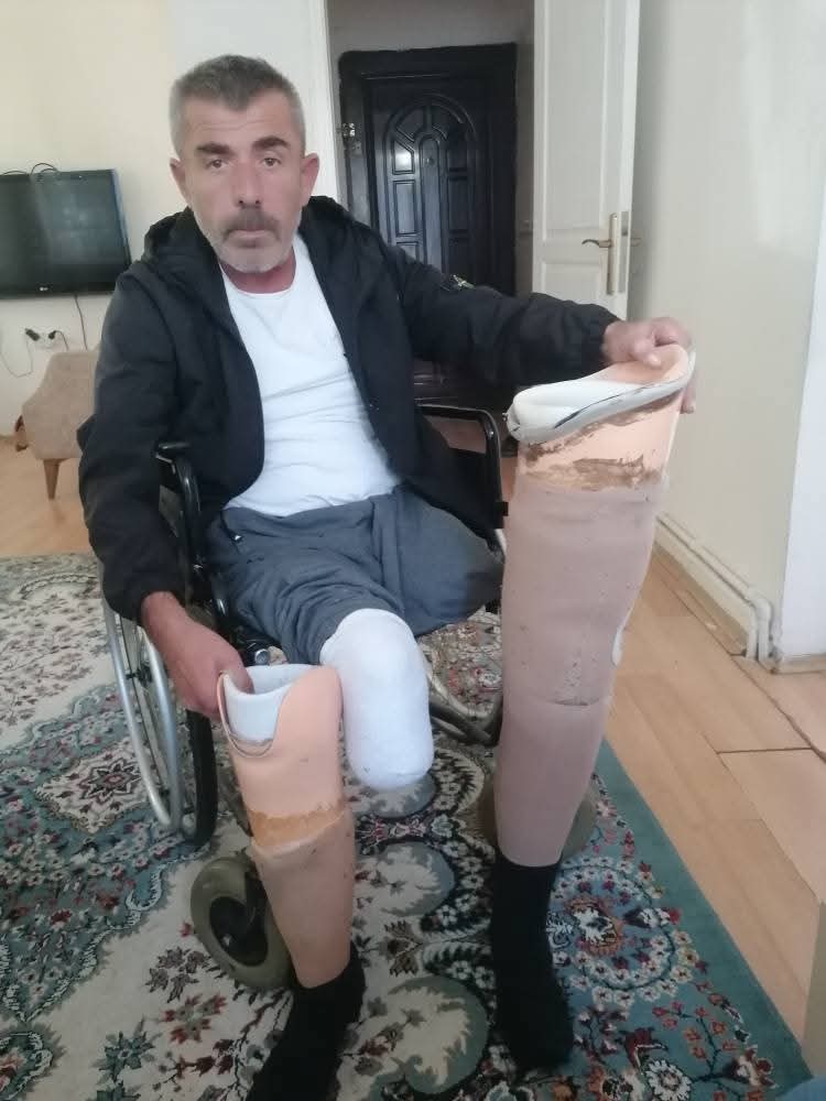 Bir bacak diz üzerinden kesilmiş bir bacak diz altından kesilmiş iki elin ikişer tane parmağı yok kesilmiş bir şekilde hayata tutunmaya çalışıyor hemde ne gelirse haktan gelir bugüne de şükürler olsun diyerek yaşıyor.