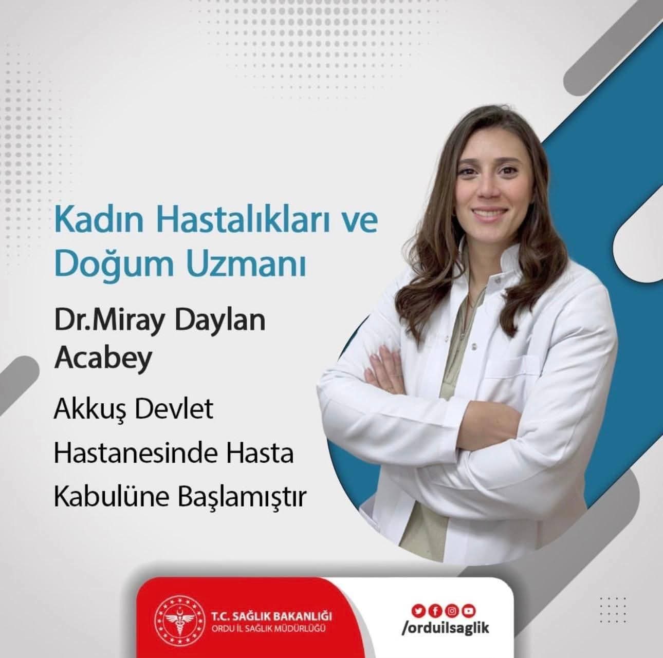Kadın Hastalıkları ve Doğum Uzmanı Dr. Miray Daylan Acabey, Akkuş Devlet Hastanesinde hasta kabulüne başlamıştır.