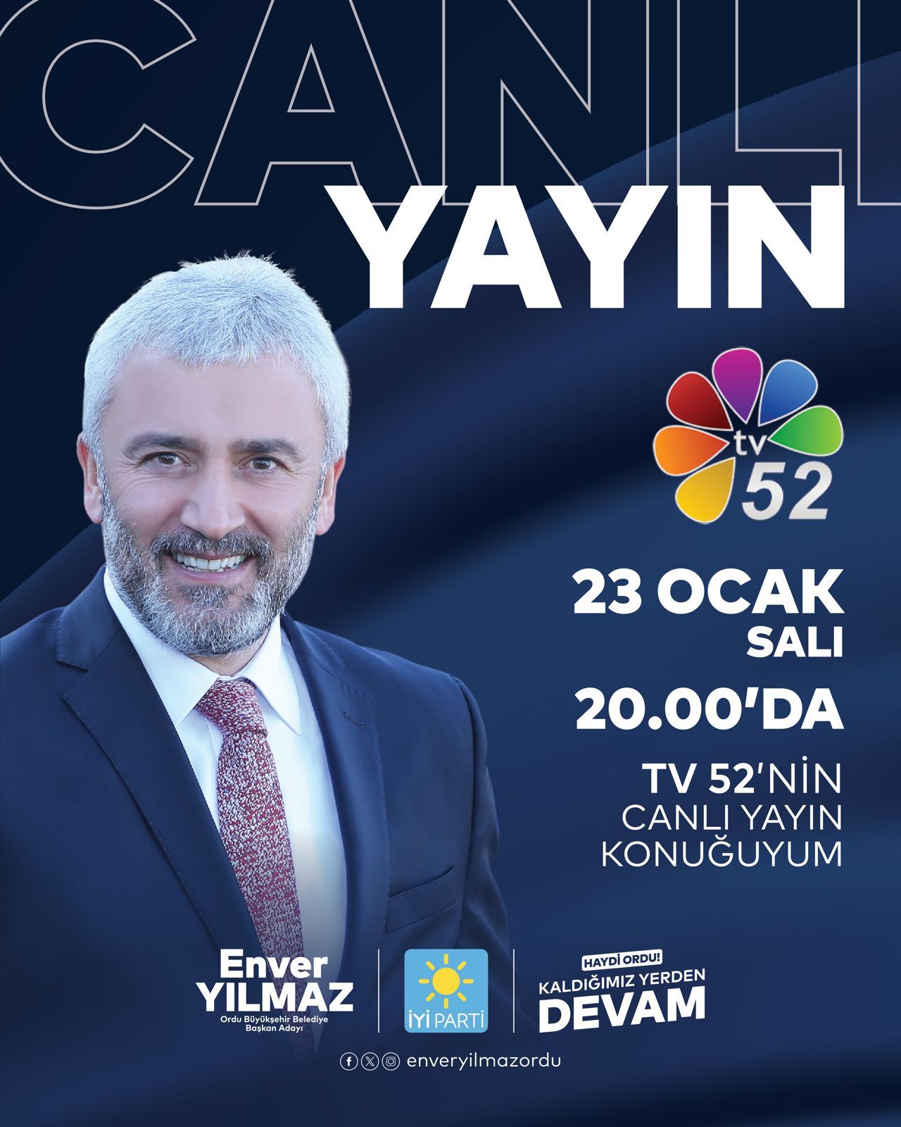 Ordu Büyükşehir Belediyesi Kurucu Başkanı ve İYİ Parti Ordu Büyükşehir Belediye Başkan Adayı Enver Yılmaz Tv 52 aracılığıyla Ordulularla buluşuyor.