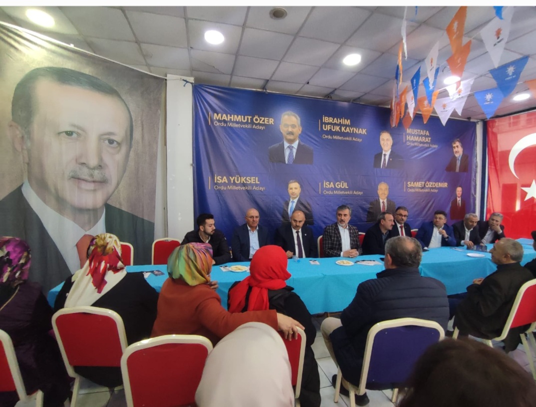 “ÖZELLİKLE BU SEÇİMİ ÇOK ÖNEMSİYORUZ” Aybastı Belediye Başkanı Beytullah Gençtan ve İlçe Başkan Fazlı Eren’inde bulunduğıu ziyarette konuşan Hamarat, “En yüksek destek aldığımız ilçelerde 14 Mayıs’ta tatlı bir yarış var. Şu ana kadar 3 ilçe AK Parti’ye en yüksek oyu alma sözü verdi. Özellikle bu seçimi çok önemsiyoruz. Bayram vesilesiyle bir aradayız ama bu arada hem bayramı hem de seçimi halkımızla değerlendiriyoruz. Esas amacımız hemşehrilerimizin derdini dinlemek. Onların sıkıntılarına çözüm bulmaktır. Bu konuda her fırsatı değerlendiriyoruz” dedi.